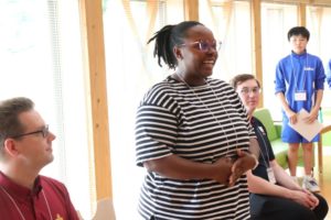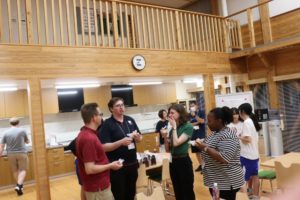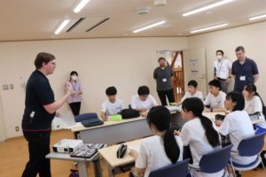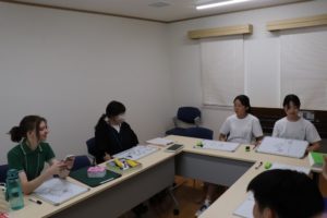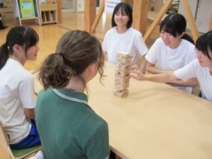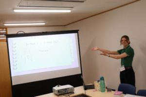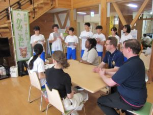 授業のあとは、夕食を食べたり、お風呂に入ってくつろいだりしました。その後、授業以外のALTの先生方とのフリータイム。ゲームや会話に笑顔が弾みました。翌日は、上中生からALTの先生方へのプレゼンテーション。学年ごとに準備してきた企画が次々と披露されました。何といっても全て英語で…というのがすごい!ALTの先生方もとても喜んでくれました。