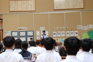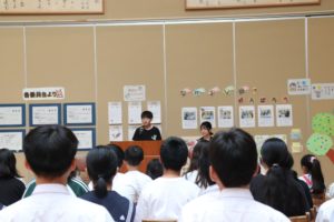 いよいよ式がスタートし、子どもたちの元気なあいさつ、高らかと歌う校歌から始まりました。このあいさつや詩には、緊張感が漂い、最も長いこの学期を「ひとすじに、うつくしく、たくましく」みんなで乗り越えていこうという決意が感じられました。最初に、今学期から学校に復帰した草彅先生から「皆さんと再び授業や学校生活を一緒に頑張ることができることを楽しみにしていました。どうぞよろしくお願いします。」とお話がありました。続いてプレゼンテーションを用いた校長先生のお話から、1学期末に実施した各種アンケート(児童生徒・保護者・職員)から現状を見て、これからの学校生活の中で個々や集団の目指す姿を子どもたちなりに確認することができました。最後に、児童生徒の代表が「夏休みの思い出と2学期の抱負」を堂々と発表してくれました。式が終わったあとには、全県席書大会と秋田県吹奏楽コンクールの表彰も行われました。