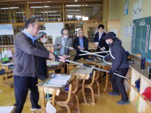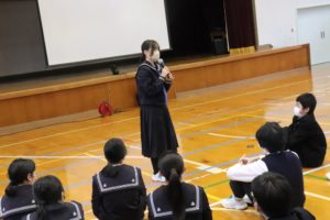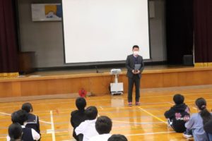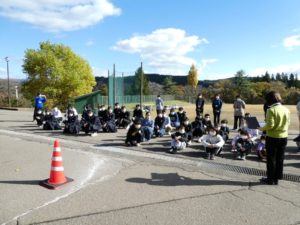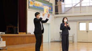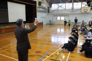 11月12日(水)に不審者対応の避難訓練が小中全校児童生徒が参加して行われました。授業中の一階4・5年生教室に突然不審者が侵入してきたという想定のもと、子どもたちは職員室にいる教員に知らせに行ったり、指示のもと外に避難したりと真剣な態度で臨みました。先生方も不審者に扮したり、さすまたで必死に押さえてそれ以上の侵入を防いだりと、本物さながらアクションを見せていました。避難したあとは体育館にて、訓練の様子をビデオで見て感想を述べたり、北秋田警察署員の方々から講評と防犯に関する講話をいただいたりしました。先生方もさすまたの正しい使い方を学ぶなど、万が一に備えることの大切さ、いざというときの対応の仕方を学べた大切な時間となりました。最後に、熊撃退スプレーが学校に配布されたことが子どもたちが伝えられました。