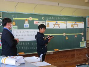 単元は「てこのはたらきとしくみ」。ねらいは、「てこを使ってより小さい力でおもりを持ち上げる方法について、支点・力点・作用点に注目して予想し、その予想を基にして実験の方法を考える」というものです。授業の中で、予想を深めるやり取りやICT機器の活用などによって子どもたちが主体的に取り組む姿が多く見られました。今後も秋田の探究型授業を追求し、授業構築や教材準備等に励んでいきたいと先生方で話し合いました。