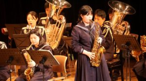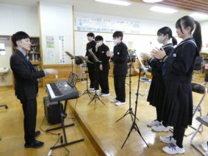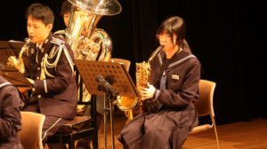 11月29日(土)は、上小阿仁村生涯学習センターにおいて「陸上自衛隊第9音楽隊演奏会」が行われました。この日は出校日で、午前中は通常授業でした。午後となり、会場に移動して待ちに待った演奏会。第1部、第2部と迫力があったりしっとり落ち着いたりする時間が進んでいきました。そして、フィナーレには何と、本校吹奏楽部の顧問の先生と部員が登場し、コラボで「宝島」を合同演奏しました。部員にとって貴重な体験となったことはもちろんのこと、それを観て、聴くことができた全校の児童生徒たちも感慨深かったと思います。国内いろいろなところで大人気の音楽隊。当日は会場に400人を超える聴衆が集まったとのこと。みんなで味わうことができ、また1つ、上小っ子、上中生に大きな思い出ができました。