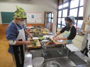 5年生の家庭科の調理実習は、今回が2回目。今回は自分たちで作ったエプロンを身に付けて、和食の基本であるご飯とみそ汁を調理することです。しかも、ご飯に使用したのは、自分たちが田植え・稲刈り体験をして、北林孝作さんからいただいたお米です。事前学習では、調理の流れを確認し、自分たちで役割分担をしました。当日は、その役割分担をもとに、臨機応変に調理を進め、時間内に手早く作り上げることができました。ご飯は、炊飯器ではなく、ガラス鍋を使って炊き上げ、米が変身する様子も見ながら調理しました。みそ汁は、出汁の基本である煮干しを使い、頭やはらわたを除く下処理も行って作りました。途中、みそだけのみそ汁を味わい、自分たちが作った出汁入りのみそ汁と比較もしました。出汁の入ったみそ汁のおいしさに、子どもたちは満足していました。実食では、自分たちで炊き上げたご飯とみそ汁のおいしさに食欲が増し、あっという間に鍋が空っぽになったようです。同じ教室で過ごす、4年生の児童は、「おいしすぎて・・・」と感動していました。自分たちで考え、やり遂げることができた5年生は、確実に最高学年に向かっているようです。