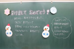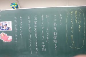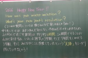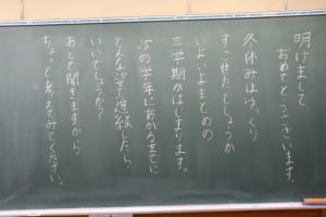 令和8年1月14日(水)、いよいよ3学期のスタートです。各学級では、各学級担任が予め黒板にメッセージを記入し、温かく児童生徒を迎え入れていました。