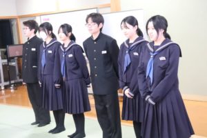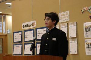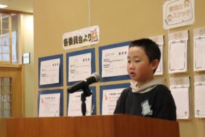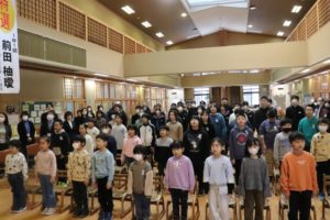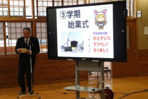 3学期の始業式が行われました。19日間の冬休みも終わり、久しぶりに見る児童生徒の表情は、少し緊張しているように見えましたが、寒さを吹き飛ばすほどの大きな校歌斉唱から始まりました。ホールいっぱいに歌声が響き渡り、久しぶりに校舎が活気づきました。続いて、校長先生のお話です。「この冬休みは、皆さんや家族の方々にとってどんな日々でしたか。思い出がたくさんできたことでしょう。」「2学期の終業式で約束した、おはようやおやすみの挨拶、ありがとうの感謝の言葉、今日はどうだったの振り返りはできましたか。」「この3学期は、中学3年生は37日、小学6年生は40日、そのほかのみんなは45日と少ない登校の日数です。是非、喜怒哀楽の感情をたくさん出して、また新しい自分を見つけ、卒業や進級につなげて生活していきましょう。」等々が話され、児童生徒たちは気持ちを新たにしていました。次に、代表児童生徒による冬休みの振り返りと今後の目標です。落ち着いて自分の思いを全校に伝えようと、一言一言をかみしめてしっかりと話すことができました。学習や生活、部活動等に取り組みたいことも具体的で頑張りが楽しみです。そのほかの児童生徒は学級活動の時間にそれぞれ行うことになります。最後に中学校では、あきたふるさとCM大賞の「未来の希望賞」、北秋田地区少年防犯弁論大会の「優秀賞」、全国防火防災に関する作文コンクールの「佳作」(各県の代表作品を集め、全国で10名が受賞)の表彰もありました。
