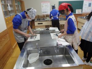 【中学1年生:家庭科】魚と野菜の調理(鰯の蒲焼きと青菜卵とじ)に挑戦し、おいしく作り上げました。