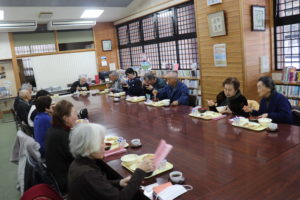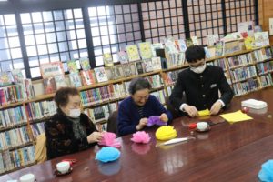 かみこあに大学(高齢者などを対象とした村生涯学習講座)の皆さんとは9月に出会いました。中学3年生が家庭科の授業で学んだ特殊詐欺の被害防止をテーマとし、クイズや寸劇を交えながら防止策を伝えたほか、村の教育や学校のことを「ザ・しゃべり場!」と題して意見交換を行いました。それが縁となり、今回2度目の交流をする運びとなりました。12日は学校の卒業式等で使用する「紙花」を一緒に作りました。そして、校内を一巡して授業の様子を参観したあと、給食の時間には豪華メニューを一緒においしくいただきました。お互いの交流がさらに深まった素晴らしい時間となりました。